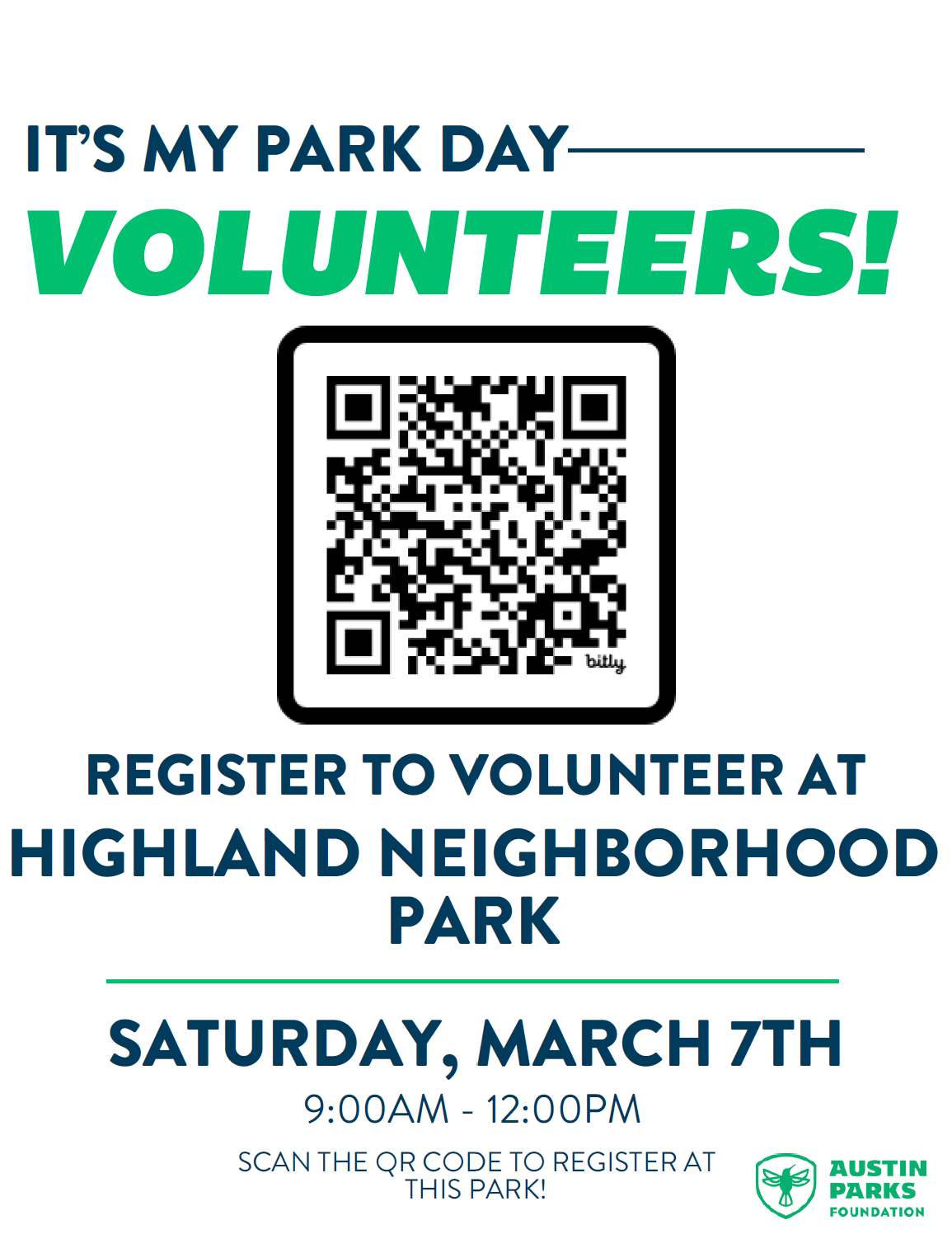 Also, I encourage everyone to join us for It’s My Park Day at Highland Neighborhood Park, on Saturday, March 7th from 9am to noon. Register here or with the QR code below.